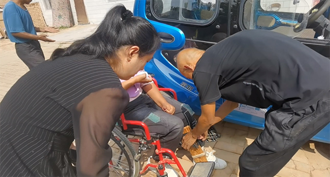 第一次見到他時,他開著一輛十分狹小的電動車,膚色黝黑,穿著一件簡單的黑色T恤。車子停下后,他利索地來到副駕駛拉開車門,轉(zhuǎn)過妻子的身體讓她面朝自己,再將她的雙臂搭在自己的脖子上,撫平她因動作而上滑的衣角,小心輕柔地將妻子放到早已備好的輪椅上。