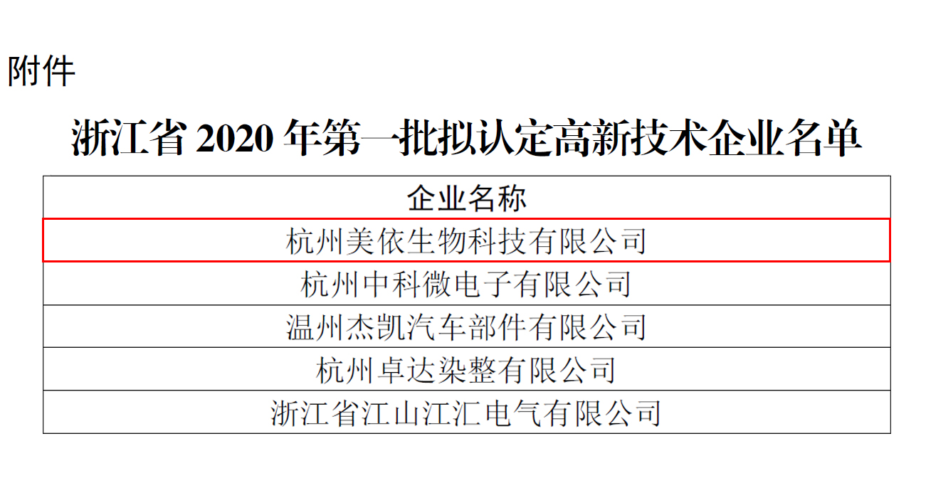 近日,根據(jù)浙江省高新技術(shù)企業(yè)認(rèn)定工作領(lǐng)導(dǎo)小組下發(fā)的根據(jù)《高新技術(shù)企業(yè)認(rèn)定管理辦法》(國科發(fā)火〔2016〕32號)和《高新技術(shù)企業(yè)認(rèn)定管理工作指引》(國科發(fā)火〔2016〕195號)有關(guān)規(guī)定所示,杭州美依生物科技有限公司,被認(rèn)定為國家2020年第一批高新技術(shù)企業(yè)。