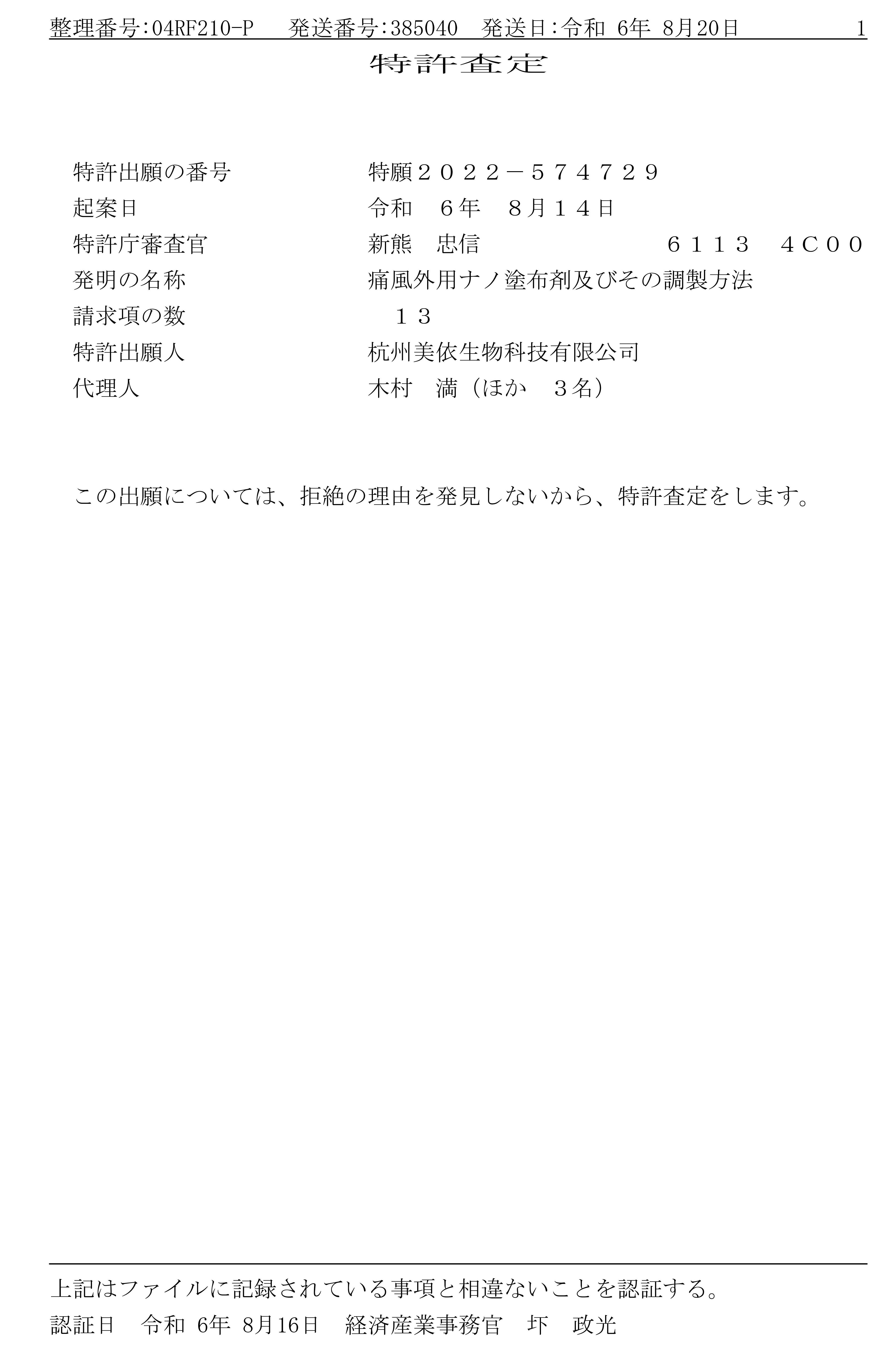 今日,杭州美依生物科技有限公司正式收到日本國家專利局頒發(fā)的PCT國際發(fā)明專利審查通知,通知顯示:由杭州美依生物科技有限公司申請的“痛風外用ナノ塗布劑及びその調製方法(痛風外用納米涂抹劑及其制備方法)”發(fā)明專利已正式通過審批。