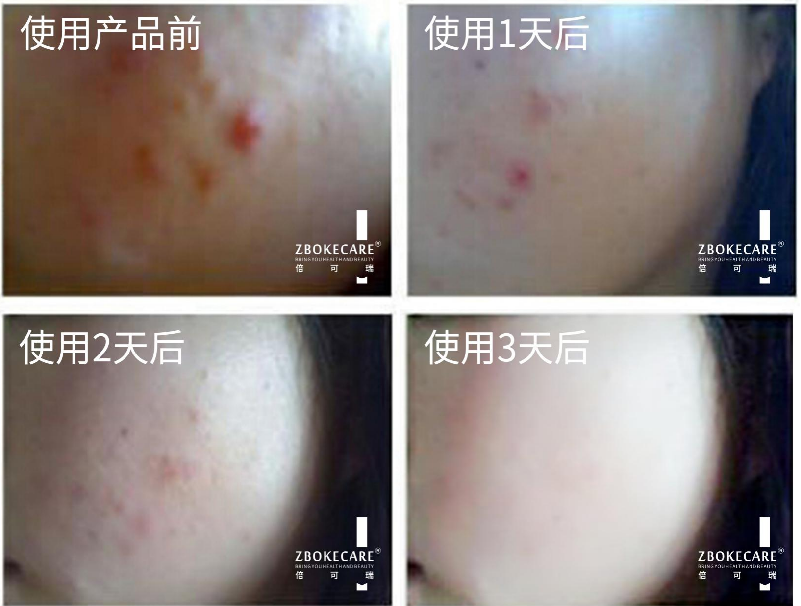 使用后狀態(tài):使用3天后,痘痘紅腫消退,不留痘印痘痕,完美修復(fù)。