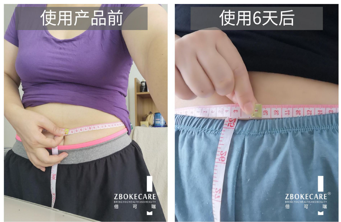 使用后:使用產(chǎn)品6天后,腹部皮膚變緊實(shí)、收緊,腰圍測(cè)量79公分,塑形6公分。