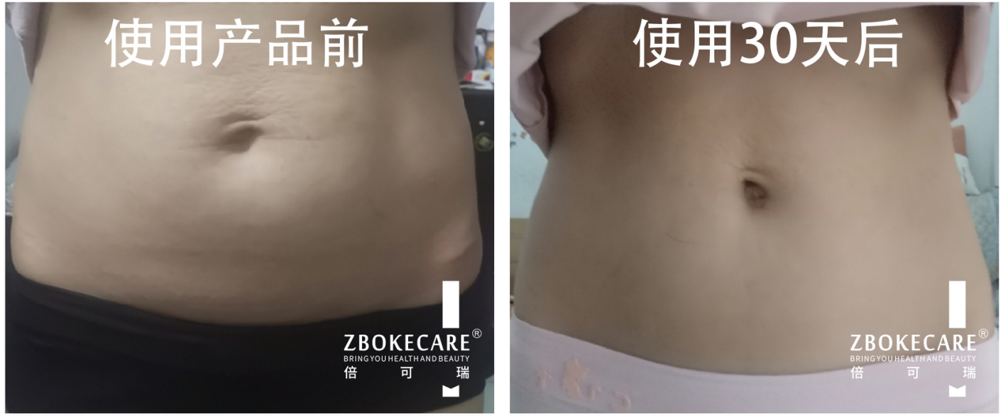 使用后:使用產(chǎn)品30天后,腹部收縮、收緊,體重減少,皮膚變嫩很多,腰圍測(cè)量77公分,塑形9公分。
