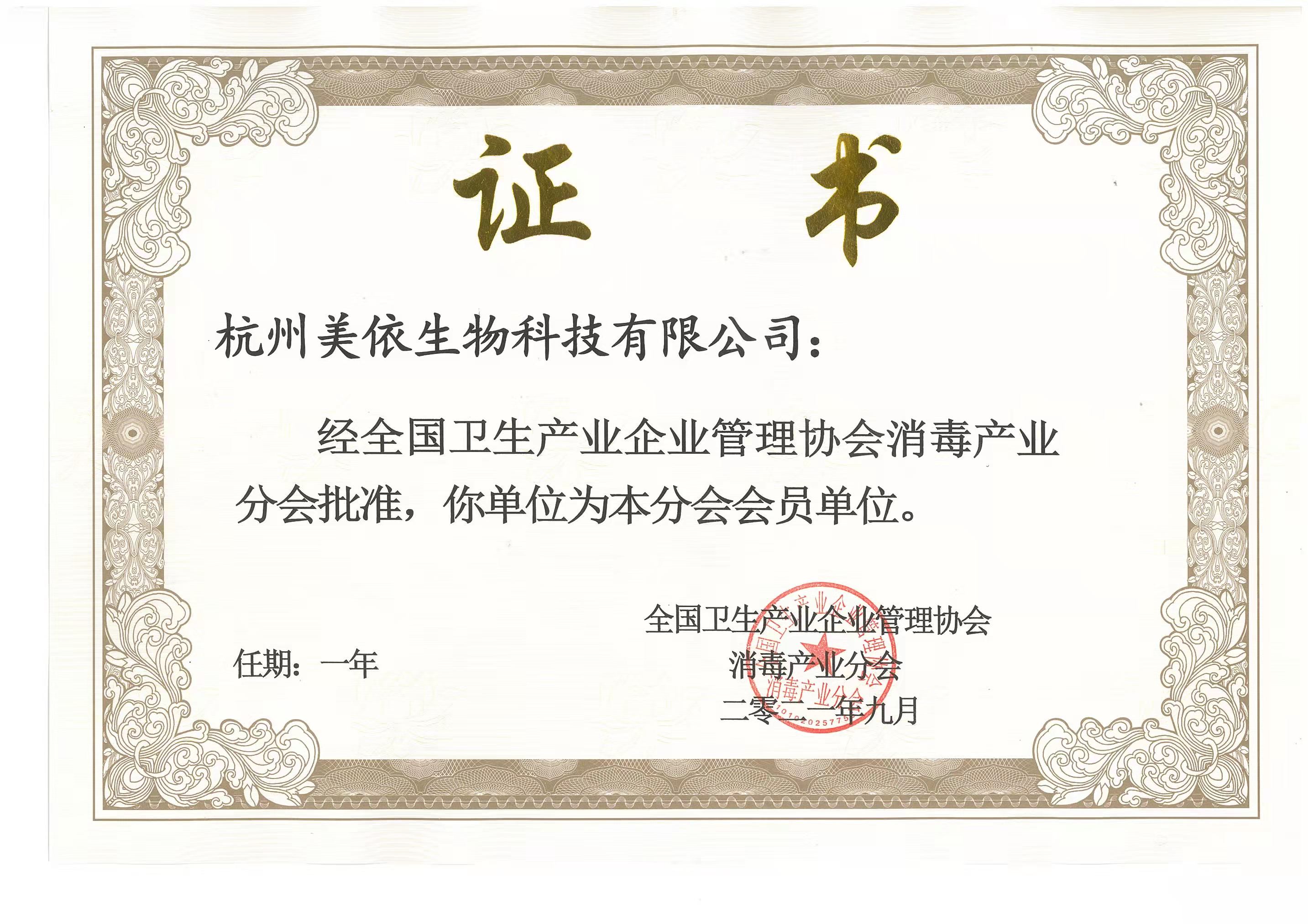今天,杭州美依生物科技有限公司現(xiàn)已收到全國衛(wèi)生產(chǎn)業(yè)企業(yè)管理協(xié)會(huì)消毒產(chǎn)業(yè)分會(huì)的會(huì)員牌匾和證書。