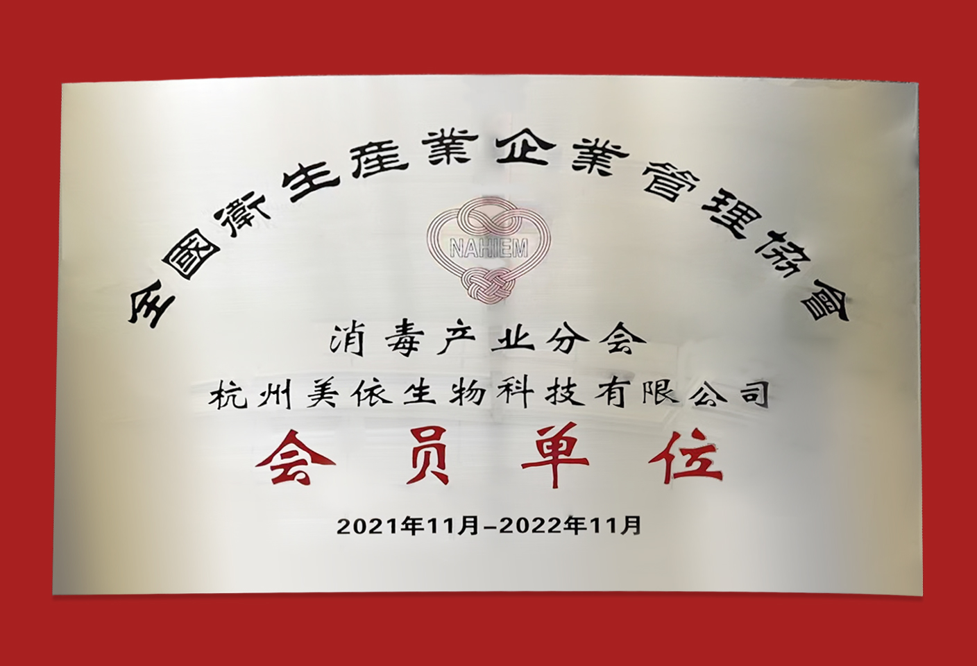 今天,杭州美依生物科技有限公司現(xiàn)已收到全國衛(wèi)生產(chǎn)業(yè)企業(yè)管理協(xié)會消毒產(chǎn)業(yè)分會的會員牌匾和證書。加入消毒產(chǎn)業(yè)分會后,我們愿與協(xié)會全體企業(yè)一起共同努力,助力全國衛(wèi)生產(chǎn)業(yè)的蓬勃發(fā)展,再創(chuàng)輝煌。努力在以習(xí)近平同志為核心的黨中央堅(jiān)強(qiáng)領(lǐng)導(dǎo)下,加快推進(jìn)健康中國,為人民健康和提高醫(yī)療衛(wèi)生水平,為衛(wèi)生與健康事業(yè)做出貢獻(xiàn)!